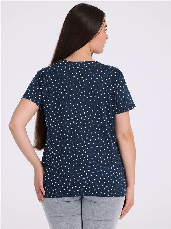 Футболка в мелкий белый горох 56 раз.- у меня ОГ= 112см- облегает нормально. Паз закрывает. Для тех, у кого полная рука- ширина рукава внизу = 36 см, длина= 22см. Цвет освежает, мне понравилась очень- очень. Рекомендую