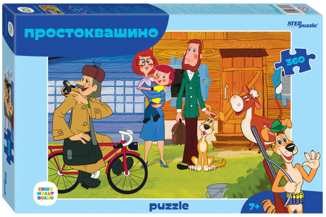 Пазл «Простоквашино» состоит из 360 деталей. На картинке мы видим почти всех главных героев: Дядю Федора с родителями, Шарика, теленка Гаврюшу и Печкина с Хватайкой.