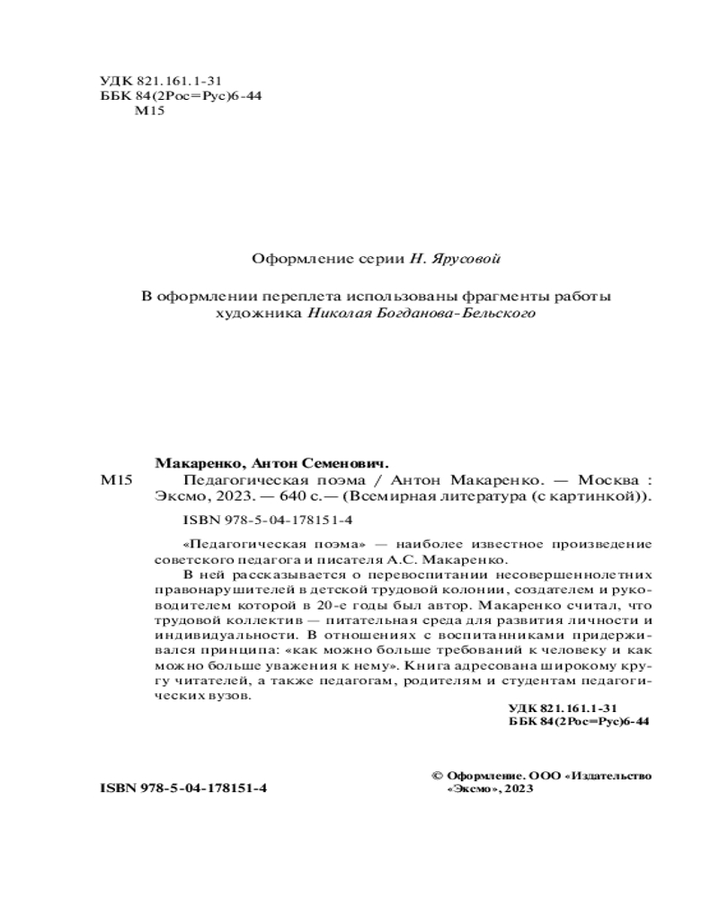 💳 Оплатить за товар можно при получении 🇰🇿 Есть бесплатная доставка по Казахстану от 1 дня 🎁 Копите бонусы с каждой покупки Серия: Всемирная литература (новое оформление) «Педагогическая поэма» — наиболее известное произведение советского педагога и писателя А.С. Макаренко. В ней рассказывается о перевоспитании несовершеннолетних правонарушителей в детской трудовой колонии, создателем и руководителем которой в 20-е годы был автор. Макаренко зародил идею, что трудовой коллектив — питательная среда для развития личности и индивидуальности. В отношениях с воспитанниками придерживался принципа: «как можно больше требований к человеку и как можно больше уважения к нему». Книга адресована широкому кругу читателей, а также педагогам, родителям и студентам педагогических вузов. |