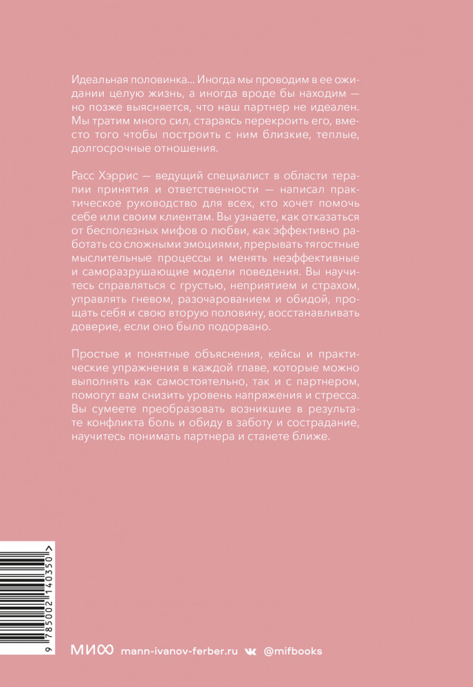 💳 Оплатить за товар можно при получении 🇰🇿 Есть бесплатная доставка по Казахстану от 1 дня 🎁 Копите бонусы с каждой покупки Серия: Любовь и отношения. Лучшие книги для пар Книга о построении взаимоотношений, углублении и психологической гибкости с перспективы терапии принятия и ответственности (ACT, Acceptance and Commitment Therapy) — одного из направлений поведенческой психотерапии. |