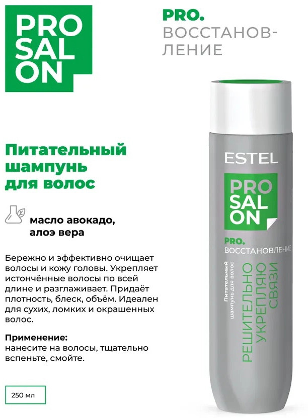 💳 Оплатить за товар можно при получении 🇰🇿 Есть бесплатная доставка по Казахстану от 1 дня 🎁 Копите бонусы с каждой покупки Серия: Pro.salon Pro.восстановление Шампунь для волос питательный бережно и эффективно очищает волосы и кожу головы. Укрепляет истончённые волосы по всей длине, разглаживает. Идеален для сухих, ломких и окрашенных волос. Придаёт плотность, блеск, объём по всей длине. |