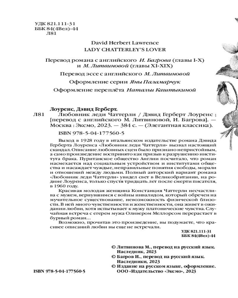 💳 Оплатить за товар можно при получении 🇰🇿 Есть бесплатная доставка по Казахстану от 1 дня 🎁 Копите бонусы с каждой покупки Серия: Элегантная классика Выход в 1928 году в итальянском издательстве романа Дэвида Герберта Лоуренса «Любовник леди Чаттерли» вызвал настоящий скандал. Описание любовных сцен было признано непристойным, а само произведение воспринято как призыв к разрушению института брака. Пуританское общество Англии посчитало, что роман насмехается над социальным устройством и институтами общества и насаждает чуждые, неправильные понятия свободы, морали и отношений между людьми. Полный авторский вариант романа «Любовник леди Чаттерли» увидел свет в Великобритании, на родине Лоуренса, только спустя тридцать лет после смерти писателя, в 1960 году. |