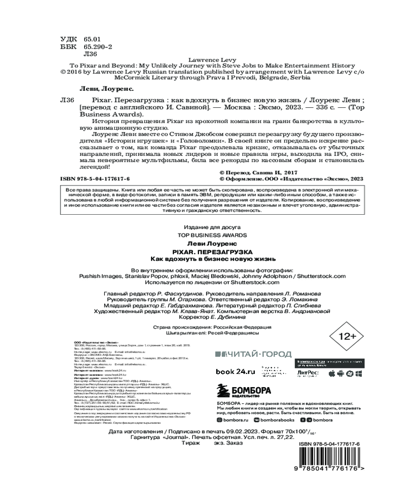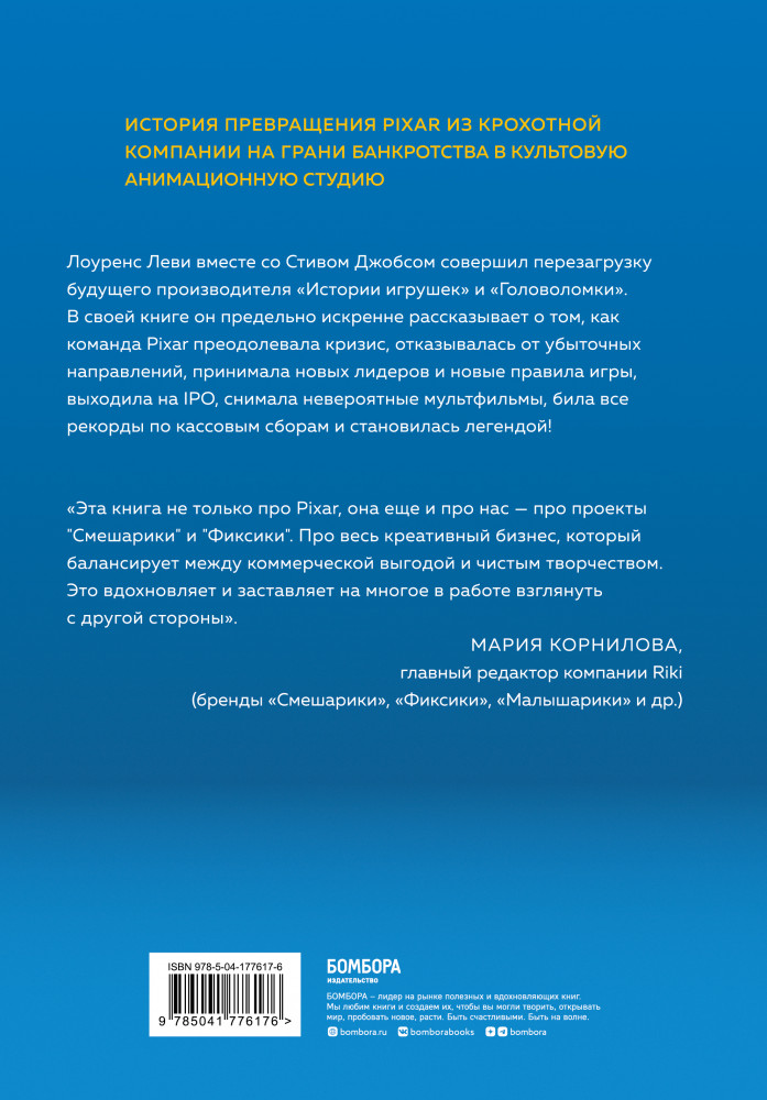 💳 Оплатить за товар можно при получении 🇰🇿 Есть бесплатная доставка по Казахстану 🎁 Копите бонусы с каждой покупки Серия: Top Business Awards История превращения Pixar из крохотной компании на грани банкротства в культовую анимационную студию. Автор книги — Лоуренс Леви, совершивший перезагрузку будущего производителя «Истории игрушек» и «Головоломки» вместе со Стивом Джобсом. Под обложкой — предельно искренний рассказ о том, как команда Pixar преодолевала кризис, отказывалась от убыточных направлений, принимала новых лидеров и новые правила игры, выходила на IPO, снимала невероятные мультфильмы, била все рекорды по кассовым сборам и становилась легендой! |