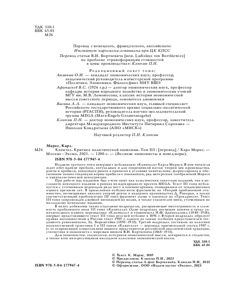 В книгу добавлены также отдельные подразделы, раскрывающие многогранность и сложность проблемного поля III тома «Капитала». Один подраздел посвящен памяти и труду замечательного нашего переводчика «Капитала» и экономиста Н.Ф. Даниельсона (1844–1918), впервые представившего текст III тома русской публике в 1896 г. Второй подраздел образует крайне малоизвестный в России текст 1905 г. одного из самых глубоких представителей тогдашнего ревизионизма Эд. Бернштейна (1850–1932). Третий подраздел составлен из классики количественной трактовки I и III томов «Капитала» — перевода оригинальной статьи 1907 г. (с ее современным осмыслением) видного представителя российской аналитической традиции, статистика и экономиста с мировым именем В.И. Борткевича (1868—1931).