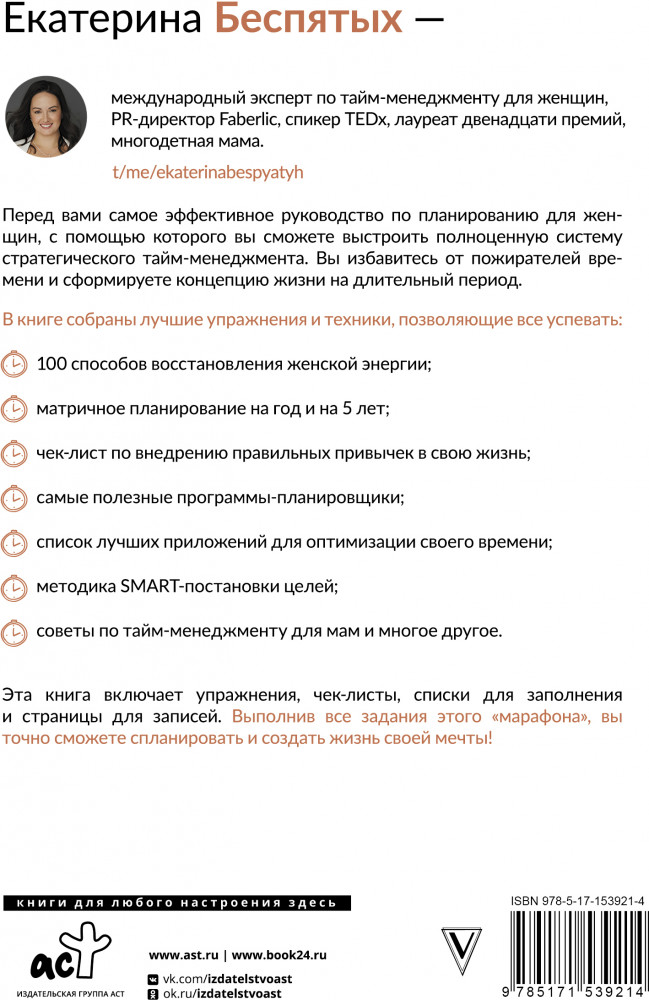 💳 Оплатить за товар можно при получении 🇰🇿 Есть бесплатная доставка по Казахстану от 1 дня 🎁 Копите бонусы с каждой покупки Серия: Тренинг-марафон Екатерина Беспятых — международный эксперт по тайм-менеджменту для женщин, PR-директор Faberlic, спикер TEDx, лауреат двенадцати премий, многодетная мама. |