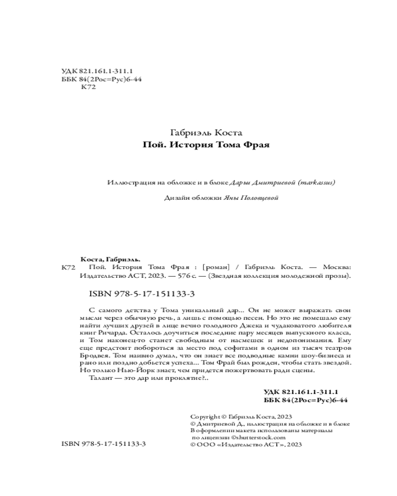 💳 Оплатить за товар можно при получении 🇰🇿 Есть бесплатная доставка по Казахстану от 1 дня 🎁 Копите бонусы с каждой покупки Серия: Звездная коллекция молодежной прозы С самого детства у Тома уникальный дар... Он не может выражать свои мысли через обычную речь, а лишь с помощью песен. Но это не помешало ему найти лучших друзей в лице вечно голодного Джека и чудаковатого любителя книг Ричарда. Осталось доучиться последние пару месяцев выпускного класса, и Том наконец-то станет свободным от насмешек и недопонимания. Ему еще предстоит побороться за место под софитами в одном из тысяч театров Бродвея. Том наивно думал, что он знает все подводные камни шоу-бизнеса и рано или поздно добьется успеха... Том Фрай был рожден, чтобы стать звездой. Но только Нью-Йорк знает, чем придется пожертвовать ради сцены. |