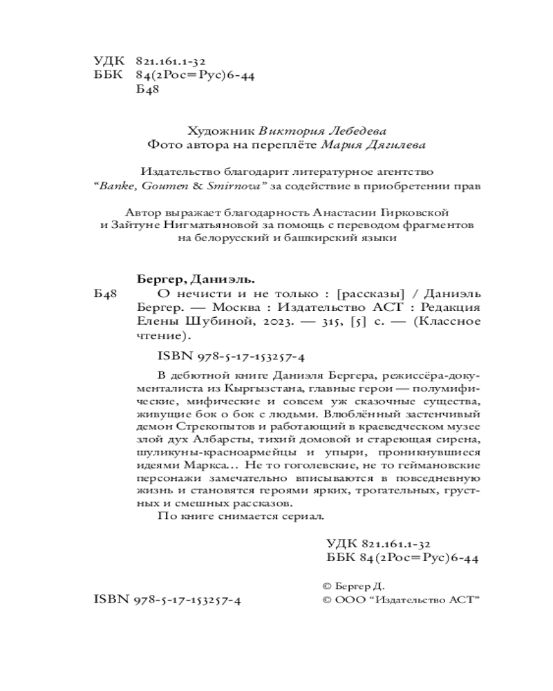 Серия: Классное чтение Даниэль Бергер (р. 1983) родился и живет в Кыргызстане, режиссер документального и игрового кино, продюсер. Книга «О нечисти и не только» — дебют в прозе.