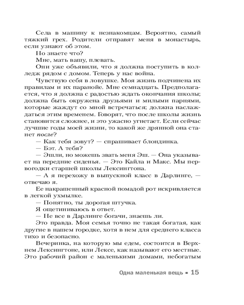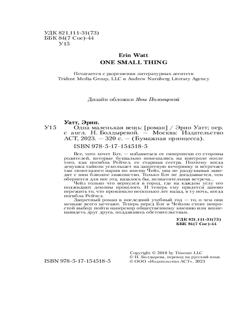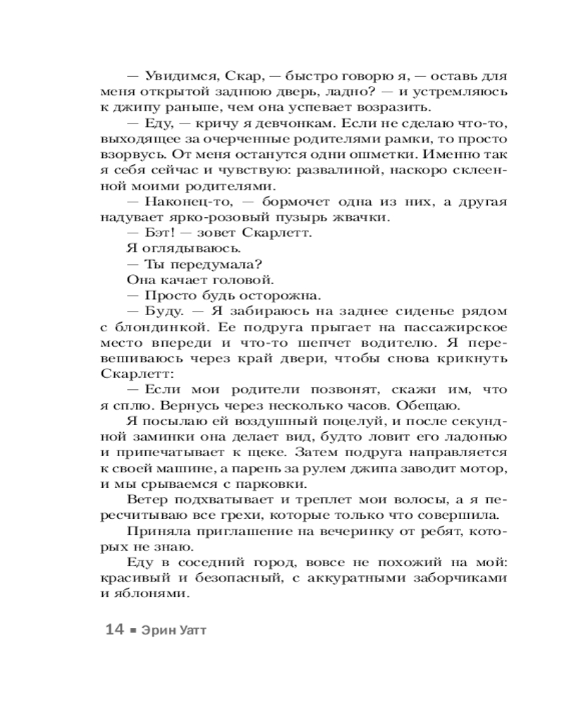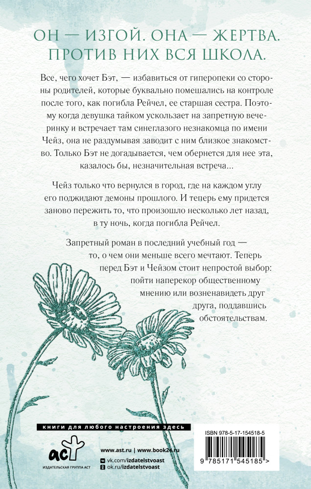 💳 Оплатить за товар можно при получении 🇰🇿 Есть бесплатная доставка по Казахстану от 1 дня 🎁 Копите бонусы с каждой покупки Серия: Бумажная принцесса Все, чего хочет Бэт, — избавиться от гиперопеки со стороны родителей, которые буквально помешались на контроле после того, как погибла Рейчел, ее старшая сестра. Поэтому когда девушка тайком ускользает на запретную вечеринку и встречает там синеглазого парня по имени Чейз, она не раздумывая заводит с ним близкое знакомство. Только Бэт не догадывается, чем обернется для нее эта, казалось бы, незначительная встреча... |