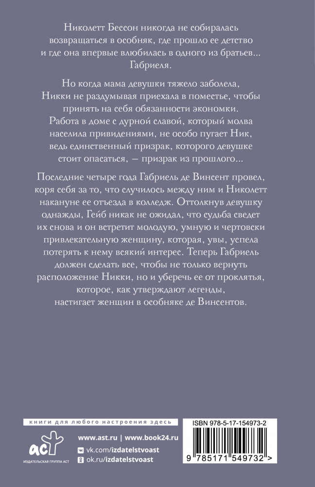Последние четыре года Габриель де Винсент провел, коря себя за то, что случилось между ним и Николетт накануне ее отъезда в колледж. Оттолкнув девушку однажды, Гейб никак не ожидал, что судьба сведет их снова и он встретит молодую, умную и чертовски привлекательную женщину, которая, увы, успела потерять к нему всякий интерес. Теперь Габриель должен сделать все, чтобы не только вернуть расположение Никки, но и уберечь ее от проклятья, которое, как утверждают легенды, настигает женщин в особняке де Винсентов. |