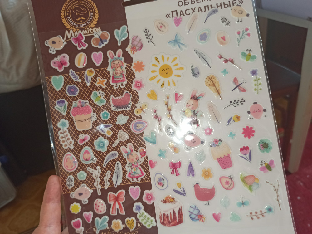 сами наклейки хорошие, но не для яиц, поверхность слишком маленькая, и из-за изгиба края не приклеиваются, для плоской поверхности отлично, долго держатся