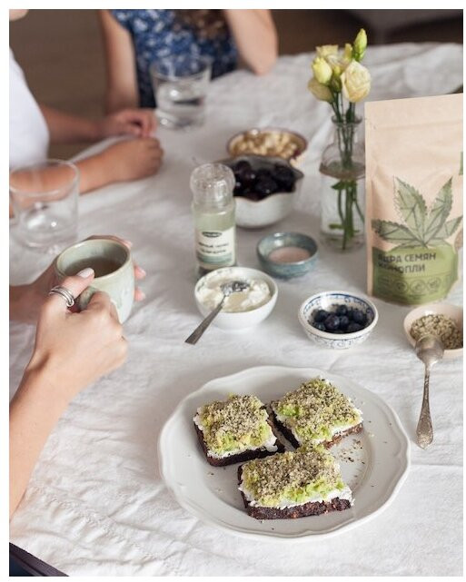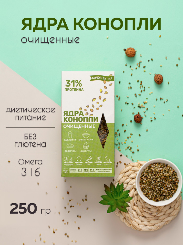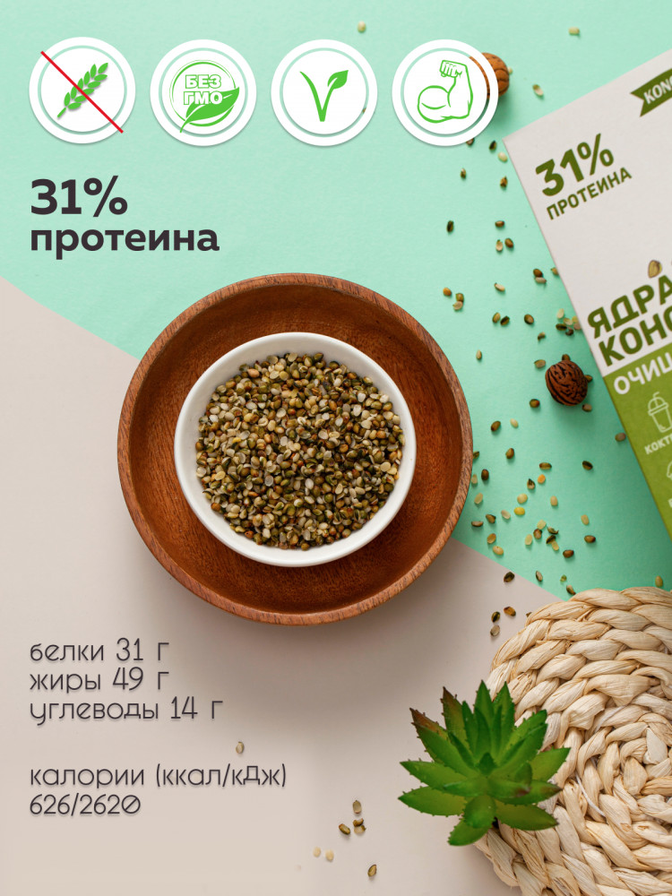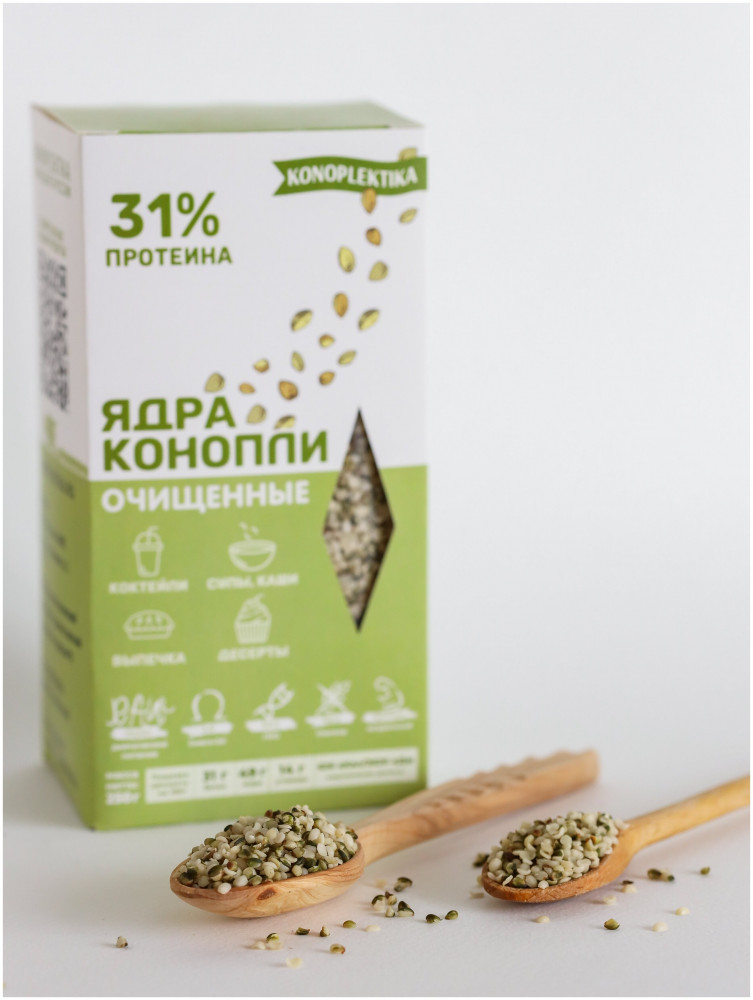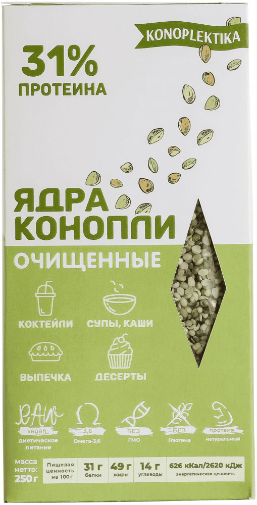 Зёрнышки небольшого размера, обладающие приятно-ореховым, слегка кедровым вкусом и нежной текстурой. Являются высококачественным источником полноценного растительного белка, витаминов, минералов и жирных полиненасыщенных кислот: Омега-3 и Омега-9. Конопля является источником редких и очень важных элементов: мезоинозита — необходим для углеводного обмена, регулирует уровень холестерина в крови; фитина — предотвращает ожирение печени при недостатке белковой пищи в рационе; аргинина — снижает риск сердечно-сосудистых заболеваний. Ядра семян конопли не содержат глютена, поэтому их могут употреблять те, кому противопоказаны пшеница, овёс и рожь.