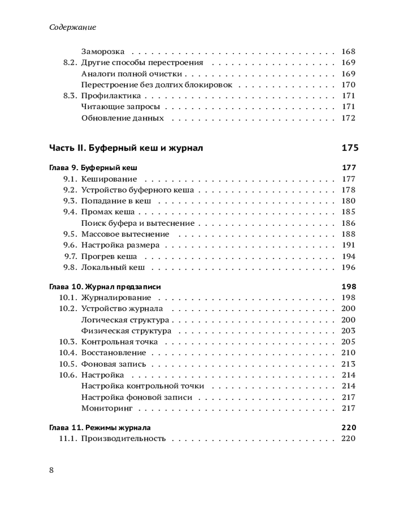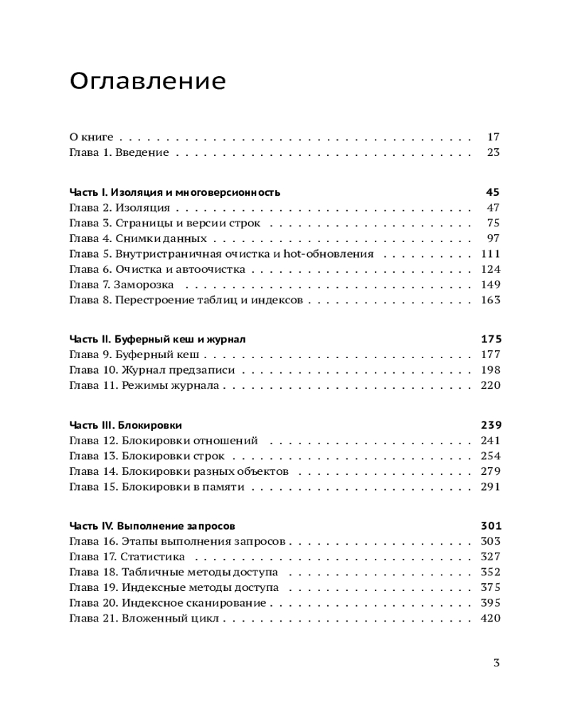 Рассматривается внутреннее устройство СУБД PostgreSQL: детали реализации многоверсионности и изоляции на основе снимков данных, включая процедуру очистки неактуальных версий строк; буферный кеш и журнал предзаписи; использование блокировок различных уровней; планирование и выполнение SQL-запросов; принципы расширяемости и особенности имеющихся индексных методов доступа. Большое внимание уделяется возможностям, предоставляемым для самостоятельного изучения механизмов функционирования PostgreSQL.