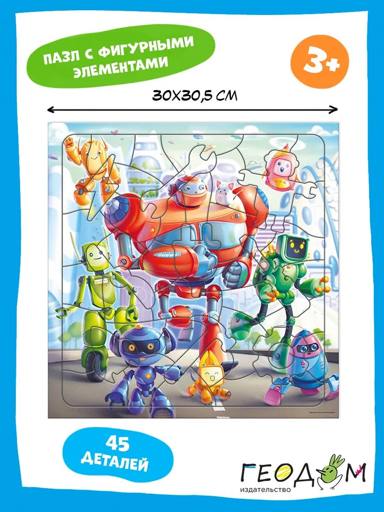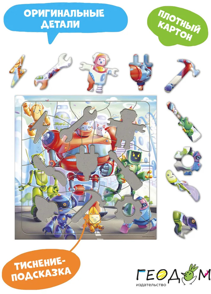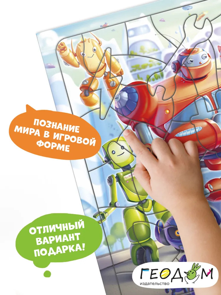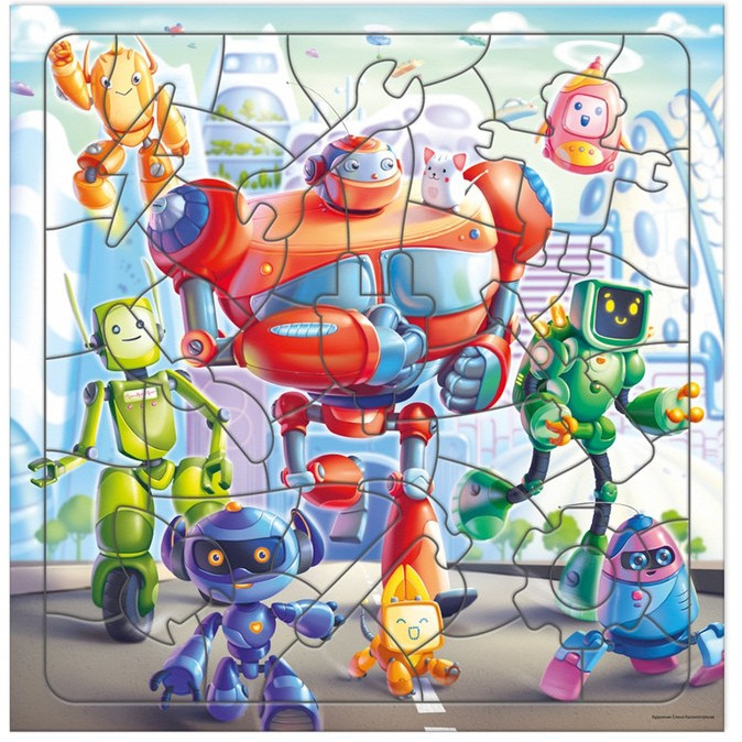 Роботы — милые создания, соберите фигурный пазл и убедитесь сами! Правильно сложите все фрагменты — и увидите команду роботов, бегущих на задание! Элементы пазла — роботы и детали механизмов: собирайте, играйте и рассматривайте! Пазл тренирует мелкую моторику, внимание, память и способствует развитию образного мышления. А благодаря рамке и фрагментам из плотного картона пазл удобно хранить и брать с собой.