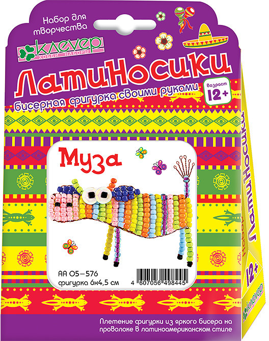 Набор «Муза» серии «Латиносики» разработан для плетения детьми старше 12 лет в виде смешной фигурки с полосками из разноцветного бисера в этно-стиллистике Латинской Америки. Загадочная корова «МУза» с большими глазами, розовым носом и аккуратной кисточкой на хвосте будет прикольно смотреться как подарок, так и в коллекции бисерных фигурок.