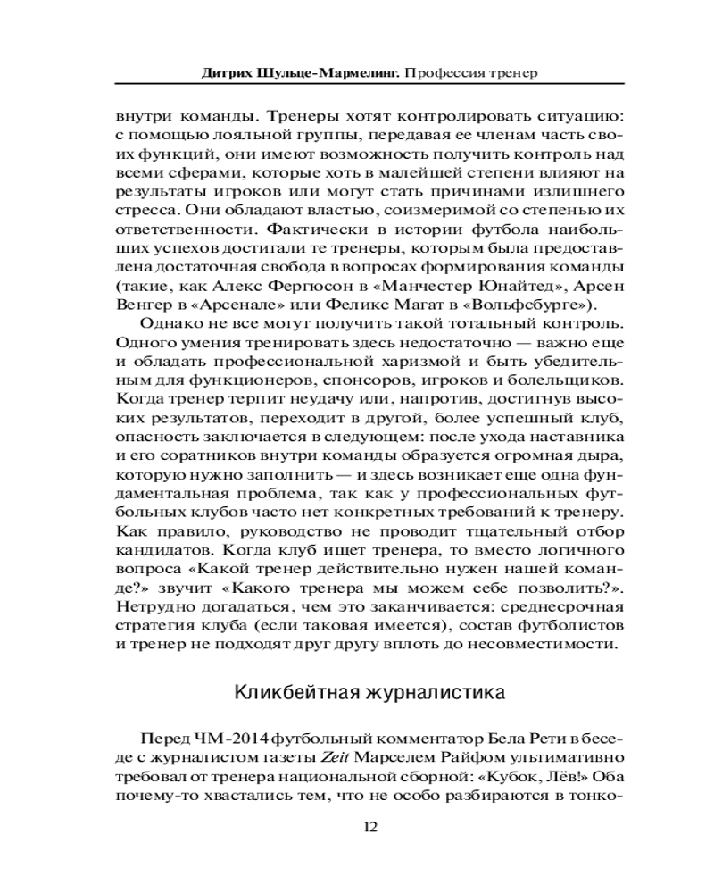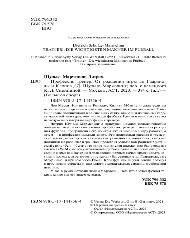 Дитрих Шульце-Мармелинг с присущей немцам педантичностью описывает историю становления профессии тренера с момента рождения футбола, превращения его из игры джентльменов в игру работяг, а затем — в профессиональный спорт. Это подробный рассказ о тренерских идеях, новаторских тактических решениях и личностях, которые повлияли на развитие игры. Вам предстоит узнать: как родился британский стиль «бей — беги»; что такое «дунайская школа»; как была создана система «W-M»; почему «тотальный футбол» голландцев изменил философию игры; как Валерий Лобановский первым начал практиковать научный подход к игре; почему тренером «Барселоны» стал Гвардиола, а не Моуринью, и причем здесь Йохан Кройфф; как Юрген Клопп вдохнул в игру новую страсть; и еще много увлекательных страниц футбольной истории.
