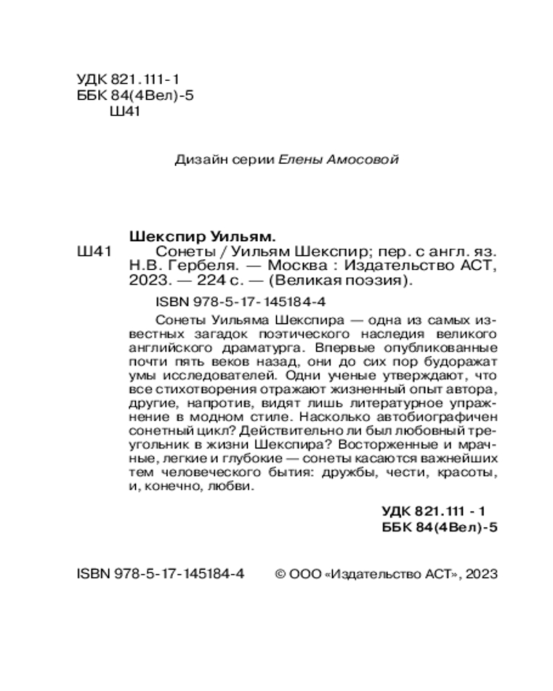 💳 Оплатить за товар можно при получении 🇰🇿 Есть бесплатная доставка по Казахстану от 1 дня 🎁 Копите бонусы с каждой покупки Серия: Великая поэзия Сонеты Уильяма Шекспира — одна из самых известных загадок поэтического наследия великого английского драматурга. Впервые опубликованные почти пять веков назад, они до сих пор будоражат умы исследователей. Одни ученые утверждают, что все стихотворения отражают жизненный опыт автора, другие, напротив, видят лишь литературное упражнение в модном стиле. Насколько автобиографичен сонетный цикл? Действительно ли был любовный треугольник в жизни Шекспира? Кто скрывается под именами Друга и Смуглой Леди? Восторженные и мрачные, легкие и глубокие — сонеты касаются важнейших тем человеческого бытия: дружбы, чести, красоты, и, конечно, любви. |