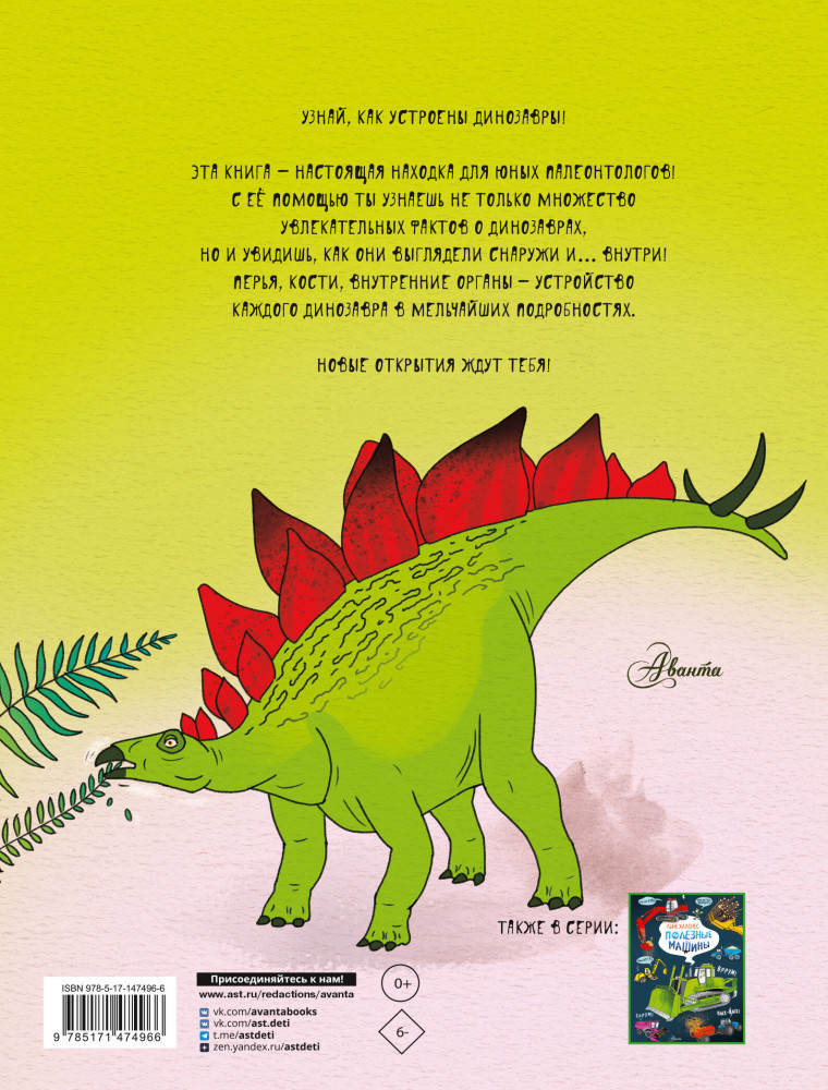 💳 Оплатить за товар можно при получении 🇰🇿 Есть бесплатная доставка по Казахстану от 1 дня 🎁 Копите бонусы с каждой покупки Серия: Как это устроено Книга «Динозавры» собрала под своей обложкой самых знаменитых и невероятных «ужасных ящеров». Велоцираптор, стегозавр, трицератопс, тираннозавр и другие. Красочно, подробно и точно — у читателей будет уникальная возможность увидеть, как устроены динозавры не только снаружи, но и внутри. |