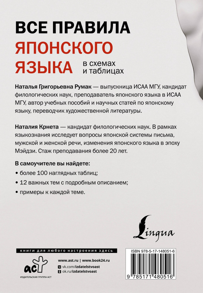 В данный момент этот товар отсутствует в продаже. Возможно, у нас найдется аналогичный или похожий товар здесь. Серия: Наглядный самоучитель Наталья Григорьевна Румак — выпускница ИСАА МГУ, кандидат филологических наук, преподаватель японского языка в ИСАА МГУ, автор учебных пособий и научных статей по японскому языку, переводчик художественной литературы.