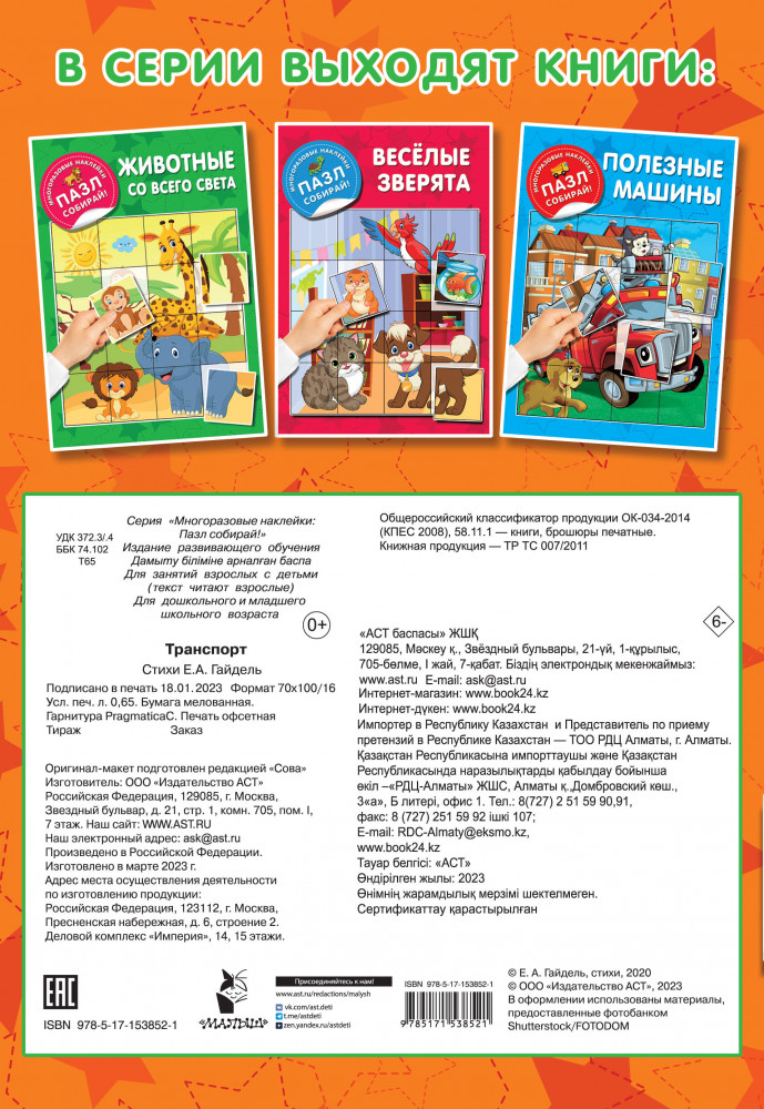 💳 Оплатить за товар можно при получении 🇰🇿 Есть бесплатная доставка по Казахстану от 1 дня 🎁 Копите бонусы с каждой покупки Серия: Многоразовые наклейки: пазл собирай! Ищите занимательную игру для ребёнка? «Транспорт» — книжка с многоразовыми наклейками, идеальная развивающая игра с крупными яркими картинками и весёлыми загадками. Играть с многоразовыми наклейками интересно, познавательно, полезно. Любознательные малыши с удовольствием послушают и отгадают загадки, а также смогут сами дополнить сюжетные рисунки стикерами. Не беда, если сложить картинку с первого раза не получается, ведь стикеры можно приклеивать на страницы книги много-много раз. |