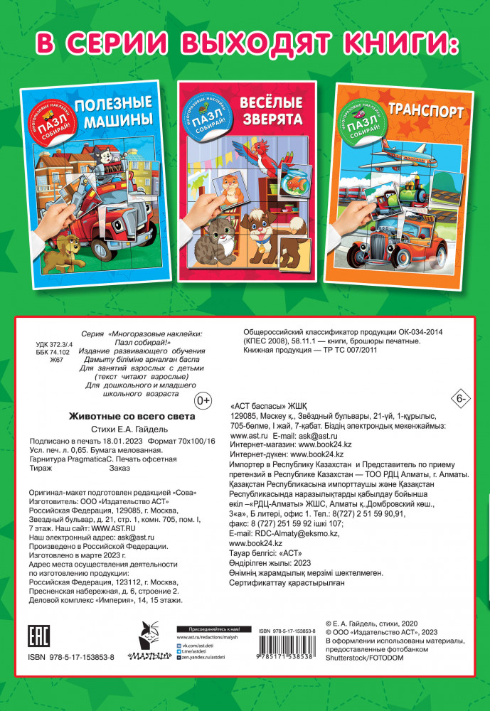 💳 Оплатить за товар можно при получении 🇰🇿 Есть бесплатная доставка по Казахстану от 1 дня 🎁 Копите бонусы с каждой покупки Серия: Многоразовые наклейки: пазл собирай! На страницах цветной книжки «Животные со всего света» малышей ждёт встреча с царственным львом, слоном-великаном, весёлым дельфином, пятнистым жирафом и другими удивительными обитателями зоопарка. Дошколята с удовольствием послушают и отгадают загадки — и сделают первые шаги в изучении фауны нашей планеты, запомнят названия животных. А ещё смогут сами дополнить сюжетные рисунки пазлами-наклейками. Не беда, если сложить картинку с первого раза не получается, ведь стикеры можно приклеивать на страницы книги много-много раз. |