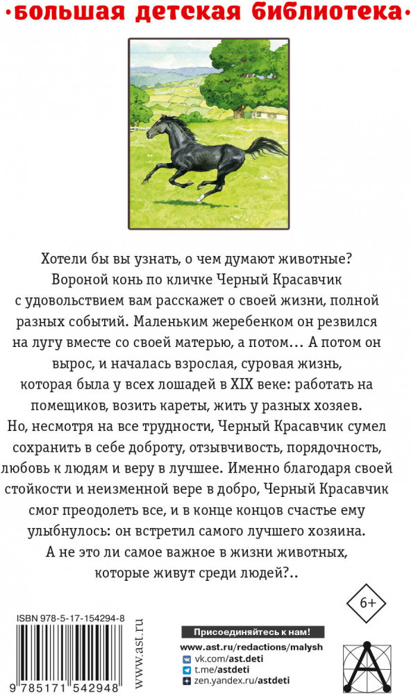 💳 Оплатить за товар можно при получении 🇰🇿 Есть бесплатная доставка по Казахстану от 1 дня 🎁 Копите бонусы с каждой покупки Серия: Большая детская библиотека «Черный Красавчик» — классика детской литературы, единственная книга английской писательницы Анны Сьюэлл (1820–1878). В этом романе ведется повествование от лица самой лошади, Черного Красавчика, который прожил долгую и не всегда простую жизнь, которая ждала лошадей в XIX веке — работать на износ на благо людей. Но Черный Красавчик не растерял веру в людскую доброту, и ему встречались хорошие хозяева, которые заботились о нем и давали надежду на счастливое будущее. Анна Сьюэлл не понаслышке знала о жизни лошадей своего времени — будучи подростком она получила серьезную травму ноги и поэтому часто пользовалась конными экипажами и научилась понимать этих умных животных, полюбив их всем сердцем. |