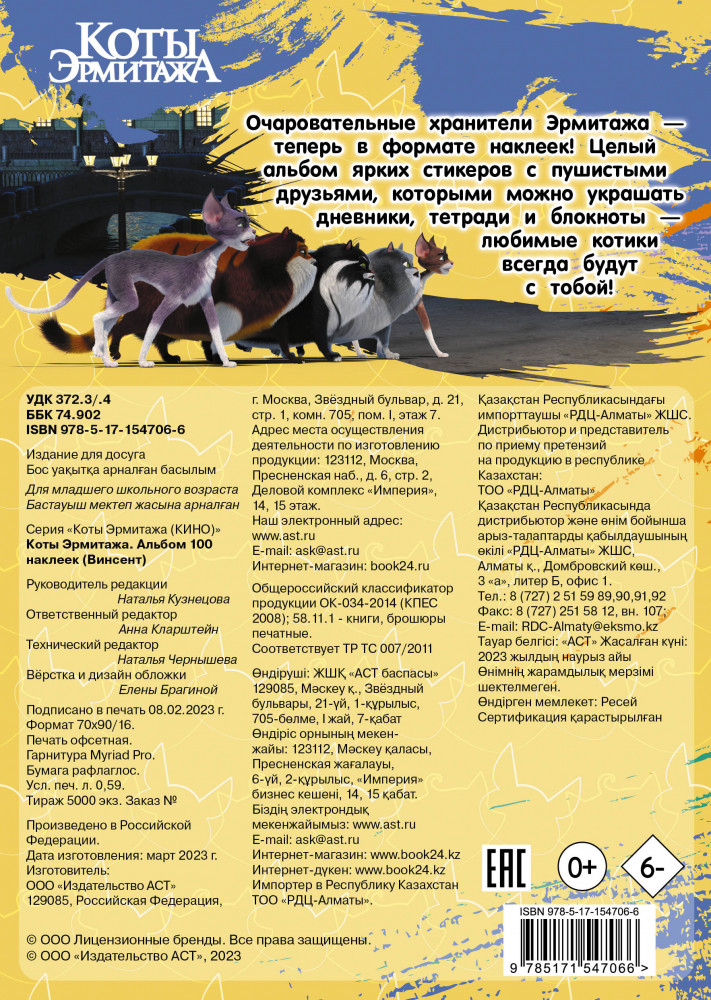 Серия: Коты Эрмитажа (КИНО) Очаровательные хранители Эрмитажа — теперь в формате наклеек! Целый альбом ярких стикеров с пушистыми друзьями, которыми можно украшать дневники, тетради и блокноты — любимые котики всегда будут с тобой! |