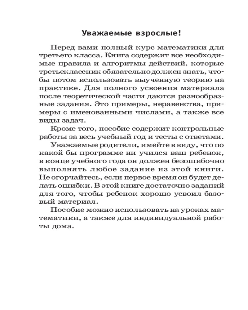 Полный курс математики. 3 класс. Все типы заданий, все виды задач, примеров, уравнений, неравенств, все контрольные работы, все виды тестовОльга Васильевна Узорова, Елена Алексеевна Нефедова В данный момент этот товар отсутствует в продаже. Возможно, у нас найдется аналогичный или похожий товар здесь. Серия: Академия начального образования (твердый переплет) Пособие содержит материал по всем темам курса математики для 3 класса: все типы заданий, все виды задач и примеров, контрольные работы и тесты, необходимые для успешного обучения ребёнка. Благодаря твёрдому переплёту книга надолго сохранит внешний вид и станет частью личной библиотеки ученика, что позволит ему в любой момент вернуться к необходимым материалам для закрепления полученных знаний. Систематическое выполнение заданий пособия развивает логическое и математическое мышление, память и внимание. Для итоговой проверки полученных знаний, умений и навыков в конце книги даны тесты с ответами и контрольные работы. Пособие можно использовать на уроках математики, а также для самостоятельных занятий дома. |