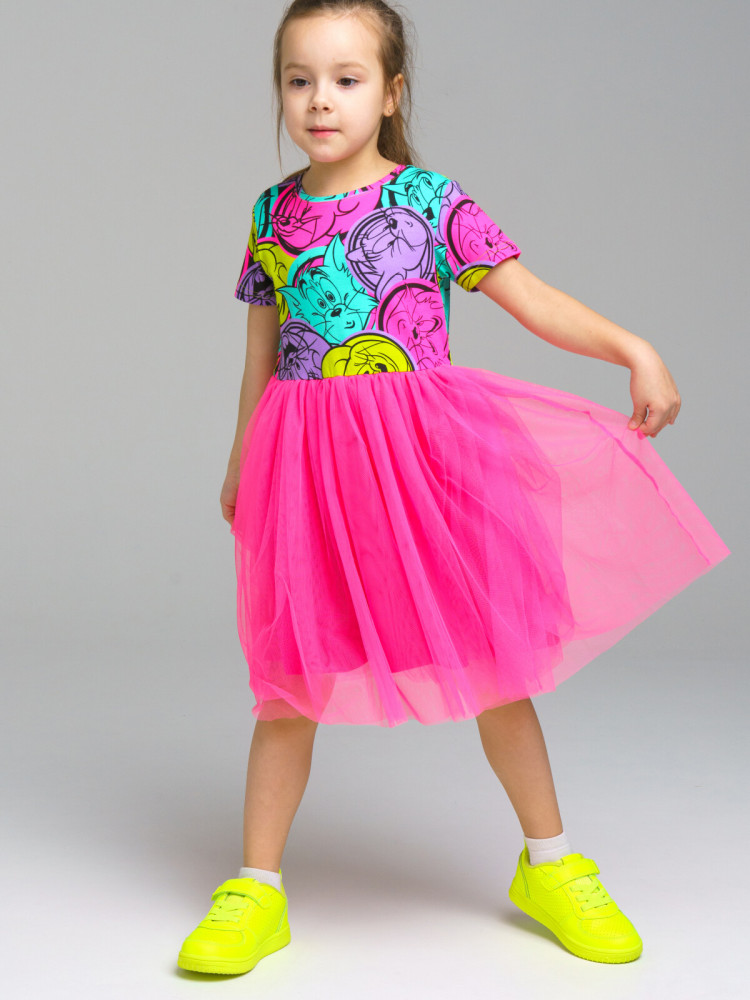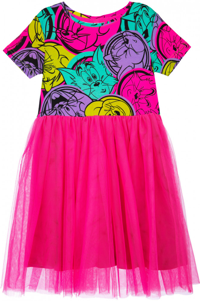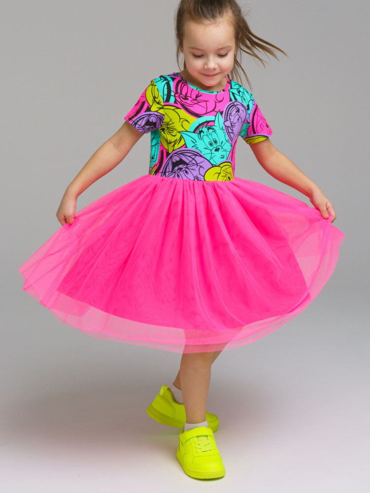 Яркое платье с юбкой из мягкой сетки. Принт с героями мультфильма «Tom and Jerry». Верх платья из качественного и приятного на ощупь трикотажа. Высокое содержание хлопка — 95%. Благодаря наличию 5% эластана в составе ткани, изделие держит форму.