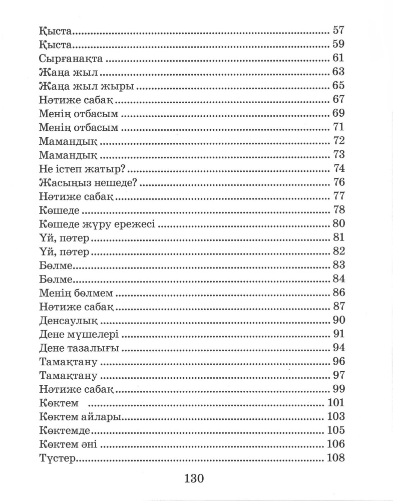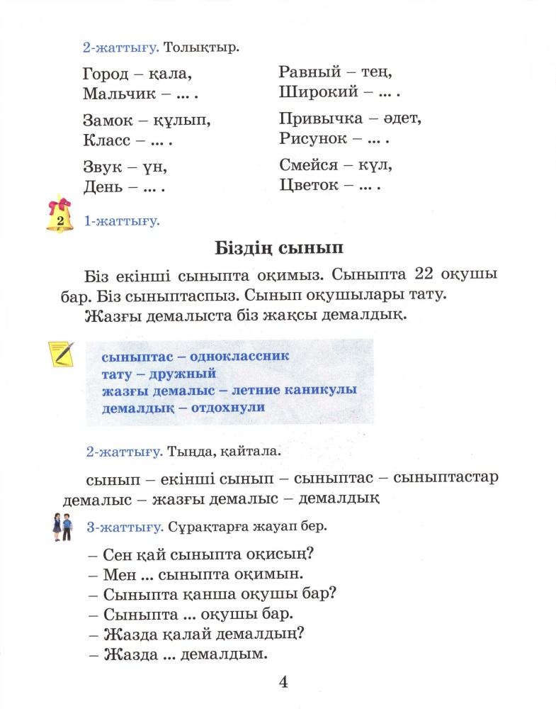 2 класс Қазақ тілі. Учебник для школ с русским языком обученияТыныштык Нурдаулетовна Ермекова В данный момент этот товар отсутствует в продаже. Возможно, у нас найдется аналогичный или похожий товар здесь. Оқулық мазмұны оқушылардың үйде, мектепте және демалыс уақытында күнделікті тілдесім әрекеттерін дамытуды көздейді. Сондықтан белгілі бір тақырыптағы мәтіндерге, оны талдап, түсіндіруге қатысты ауызша сұрақ-тапсырмалар мен жазбаша жаттығуларға көп көңіл бөлінеді. Оқушылардың ойлау қабілетін, сабаққа қызығушылығын арттыру мақсатында рөлдік ойындар, жұмбақтар мен сөзжұмбақтарға да орын берілге. |