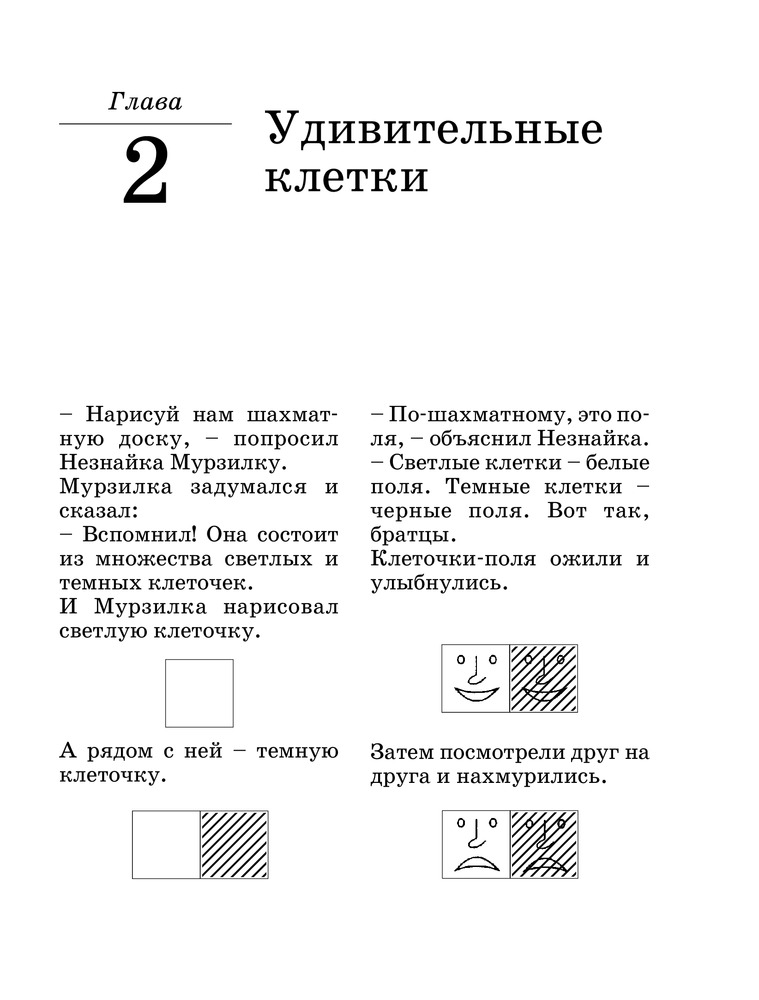 Книга представлена в виде беседы незнайки, дюймовочки и пиннокио о шахматах. Даются советы родителям с чего начинать знакомство с шахматами - в начале названия фигур, цвет полей и т.п. Далее каждая глава посвящена отдельной шахматной фигуре - как она выглядит, ходит. Каждому уроку соответствуют определенные задания. Замечательная книга!
