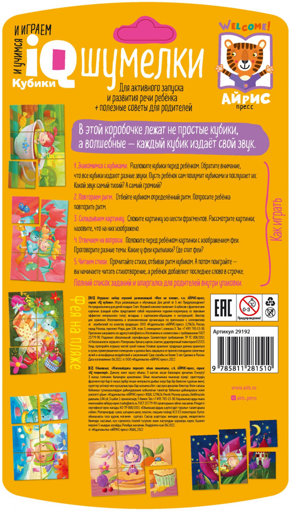 💳 Оплатить за товар можно при получении 🇰🇿 Есть бесплатная доставка по Казахстану от 1 дня 🎁 Копите бонусы с каждой покупки Серия: IQ Кубики Набор состоит из 6 кубиков, из которых можно сложить 6 картинок с изображением маленькой феи. Благодаря различным наполнителям каждый кубик издаёт свой звук. Ребёнок учится различать звуки, их громкость, отбивать ритм, слушает ритмические стихи. В процессе игры развиваются фонематический слух, активная речь, мышление, умение работать по образцу, происходит знакомство с понятиями «часть и целое». Наклейки на кубики сделаны из качественной гладкой бумаги, которая не портится от игры. |