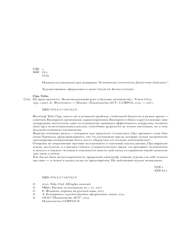 💳 Оплатить за товар можно при получении 🇰🇿 Есть бесплатная доставка по Казахстану от 1 дня 🎁 Копите бонусы с каждой покупки Серия: Corpus. Если мыслить оптимистично, история человечества только начинается. Наш вид может просуществовать миллиарды лет — достаточно времени, чтобы покончить с болезнями, нищетой и несправедливостью и процветать в невероятных для сегодняшнего дня условиях. Но это грандиозное будущее находится под угрозой. С появлением ядерного оружия человечество вступило в новую эпоху, когда мы столкнулись с рисками экзистенциальных катастроф — таких, после которых мы никогда не оправимся. С тех пор эти опасности только умножились: от изменения климата до создания патогенных микроорганизмов и искусственного интеллекта. |