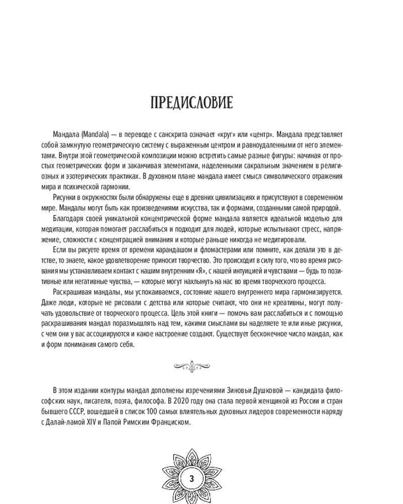 💳 Оплатить за товар можно при получении 🇰🇿 Есть бесплатная доставка по Казахстану от 1 дня 🎁 Копите бонусы с каждой покупки Серия: Мандалы для релакса Зиновья Душкова — философ и первая женщина из России и стран бывшего СССР, вошедшая в список 100 самых влиятельных духовных лидеров современности наряду с Далай-ламой XIV и Папой Римским Франциском. |
