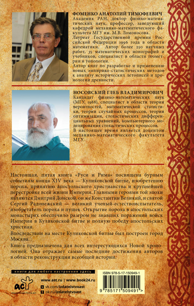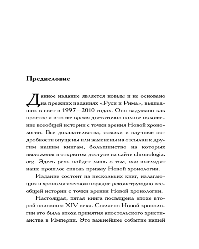 В данный момент этот товар отсутствует в продаже. Возможно, у нас найдется аналогичный или похожий товар здесь. Серия: Новая Хронология. Реконструкция истории Настоящая, пятая книга «Руси и Рима» посвящена бурным событиям конца XIV века — Куликовской битве, изобретению пороха, принятию апостольского христианства и крупнейшей перестройки всей жизни Империи. Главными героями той эпохи являются Дмитрий Донской, он же Константин Великий, и святой Сергий Радонежский — великий ученый-естествоиспытатель, изобретатель пороха и пушек. Открытие пороха в апостольских монастырях обеспечило разгром не знавших поражений войск Империи в Куликовской битве и полную победу апостольских христиан.