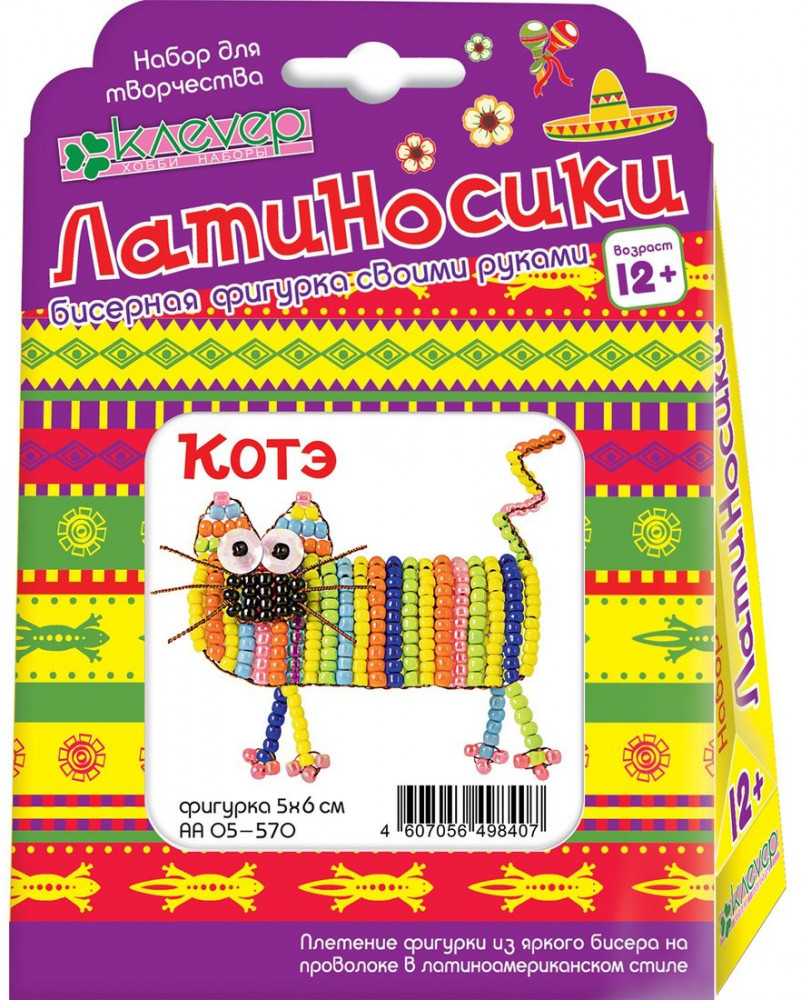 Набор «Котэ» серии «Латиносики» разработан для плетения смешной фигурки с полосками из разноцветного бисера в этно-стиле Латинской Америки.Толстый «Котэ»-кот с большими удивлёнными глазами, большим чёрным носом, тонкими лапками и изогнутым хвостом будет прикольно смотреться как подарок, так и в коллекции бисерных фигурок.
