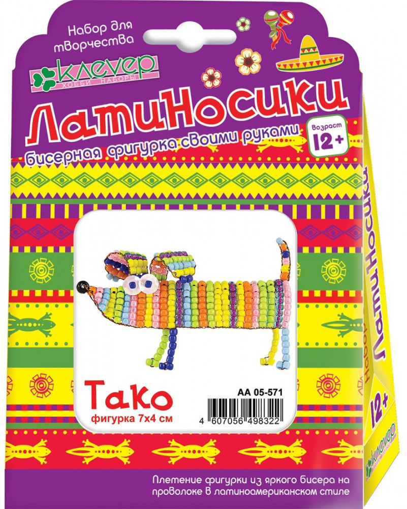 Набор «Тако» серии «Латиносики» разработан для плетения смешной фигурки с полосками из разноцветного бисера в этно-стиле Латинской Америки. Длинная такса «Тако» с большими удивлёнными глазами, большими ушами и тонкими лапками будет прикольно смотреться как подарок, так и в коллекции бисерных фигурок.