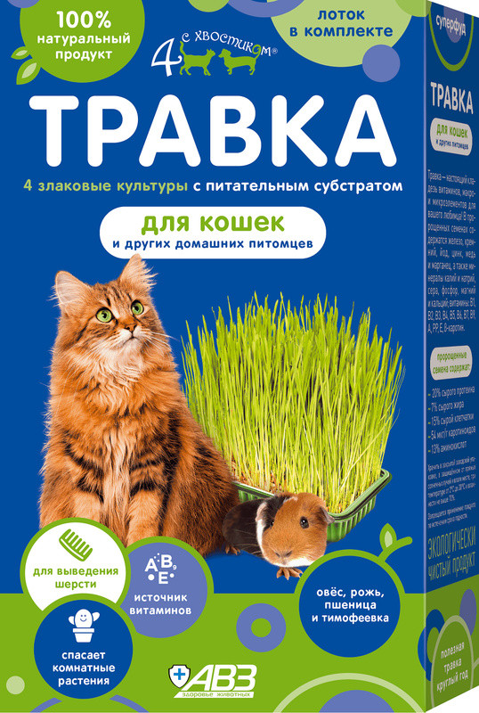 Пророщенная травка «Четыре с хвостиком» дарит здоровье и комфорт кошкам и другим домашним питомцам (собакам, птицам, грызунам, рептилиям) круглый год. В набор для проращивания входят семена овса ярового, ржи озимой, пшеницы и тимофеевки луговой, ростки которых оказывают благотворное влияние на организм питомца. Свежая травка — настоящий кладезь витаминов, макро- и микроэлементов. В пророщенных семенах содержатся: железо, кремний, йод, цинк, медь и марганец; минералы: калий, натрий, сера, фосфор, магний и кальций; витамины: В1, В2, В3, В4, B5, В6, В7, В9, A, PP, Е, β-каротин.
