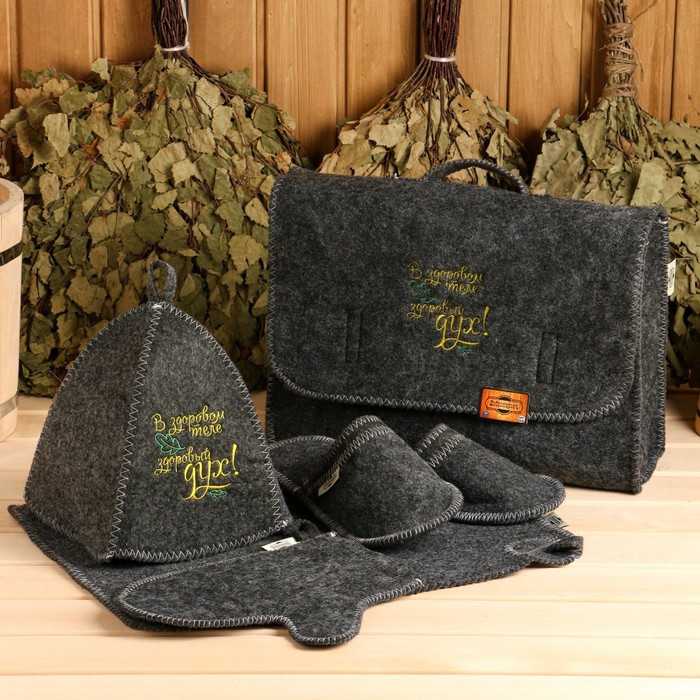 В портфеле можно хранить банные принадлежности и средства личной гигиены. Банная шапка защитит голову от перегрева, волосы от ломкости, а рукавица — от случайных ожогов. Тапочки из войлока и коврик впитывают влагу и сохраняют сухость, что обеспечивает комфорт во время посещения парной.