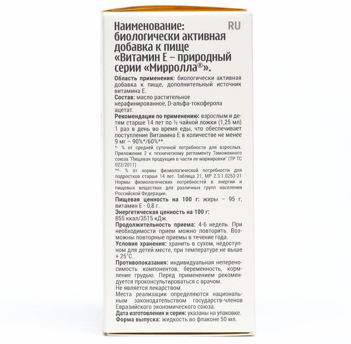 Mirrolla БАД «Витамин Е»+39 жидкая форма для лица большой объём удобная форма