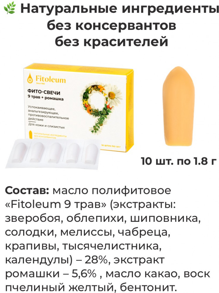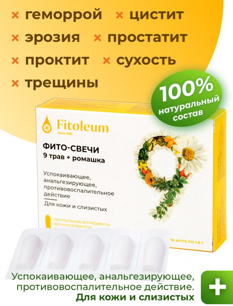 Fitoleum Фито-свечи «9 трав и ромашка»+40 натуральный состав быстро действует увлажняет удобное применение