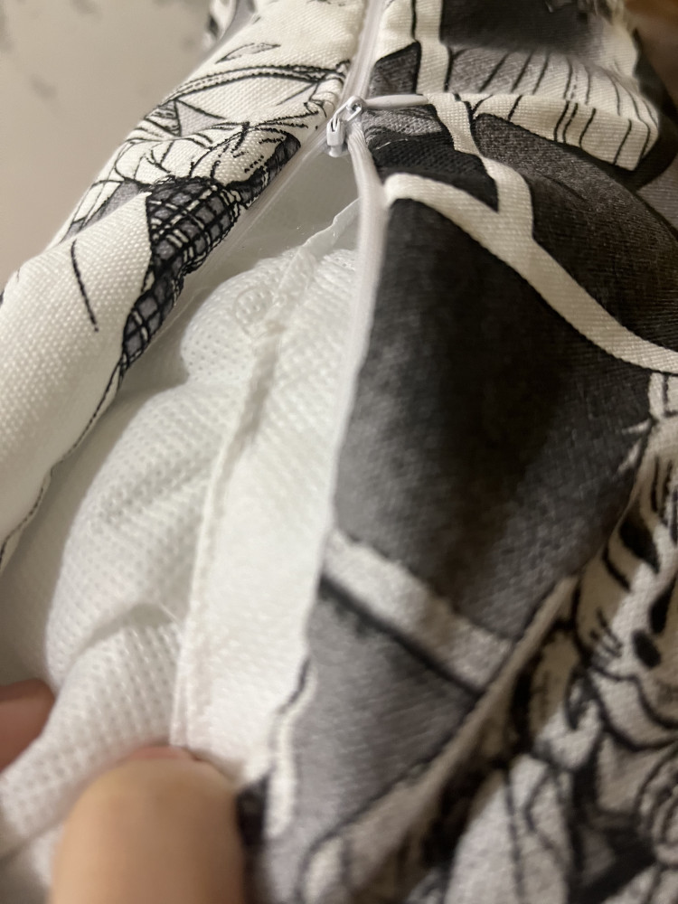 Плотная ткань, хорошее наполнение без проплешин, наволочку можно снять и постирать