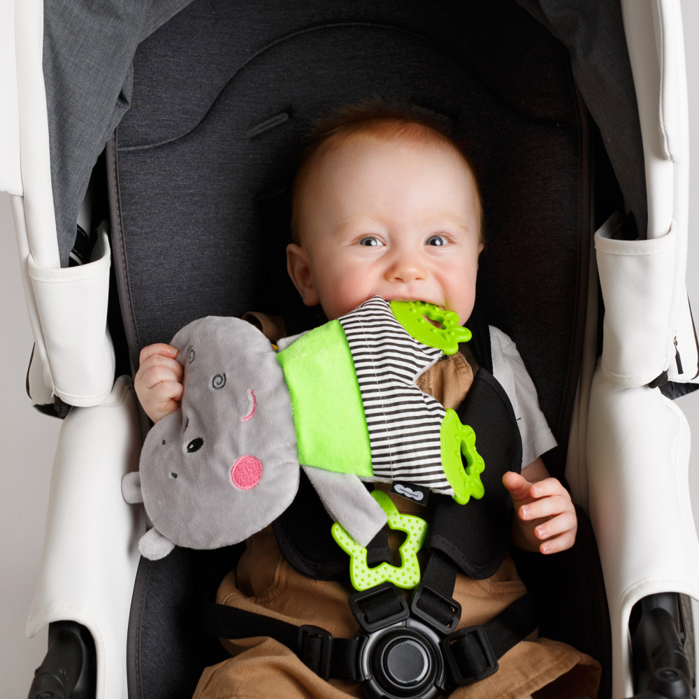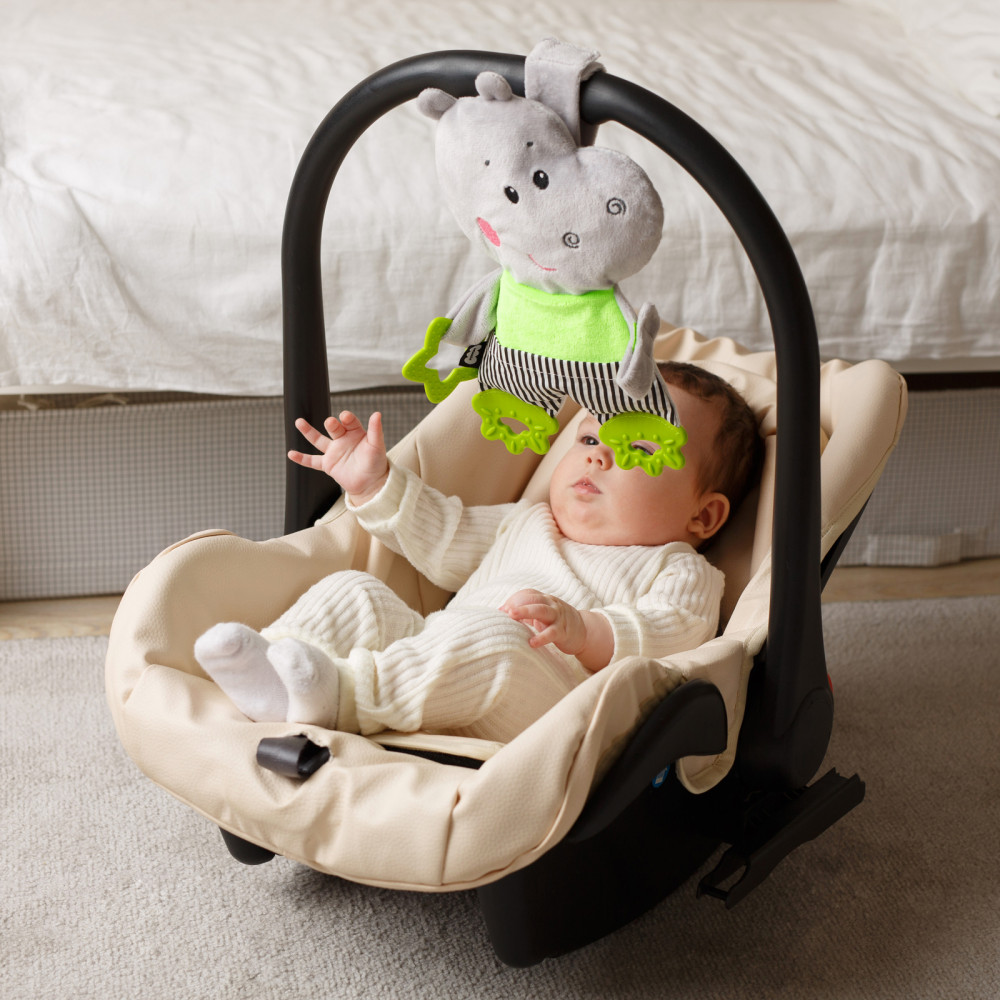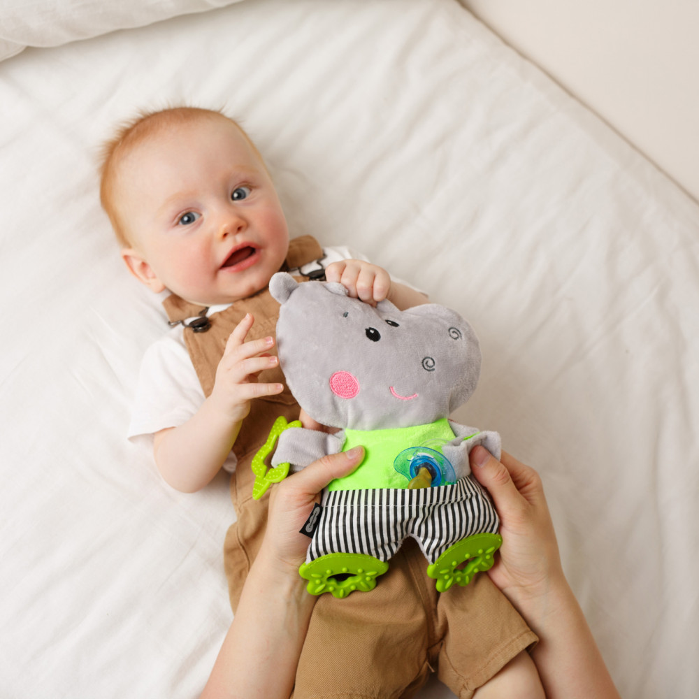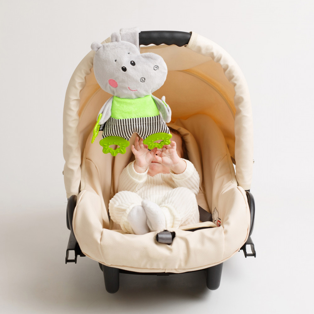 На спинке героя находится крепкая липучка, поэтому игрушка удобно крепится к коляске и автокреслу. Красивую, модную игрушку приятно брать с собой на прогулку и в путешествия. Также Бегемотика можно зафиксировать на кроватке ребенка. Малыш заинтересуется красочным и милым персонажем, внутри которого забавная шуршалка, издающая смешные звуки. Мягкие грызунки на лапках уменьшат дискомфорт при прорезывании зубов малыша.