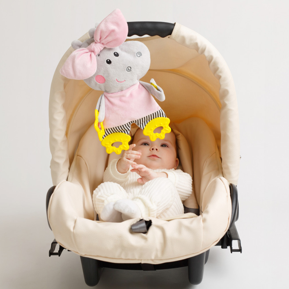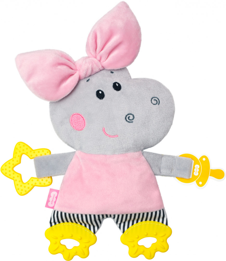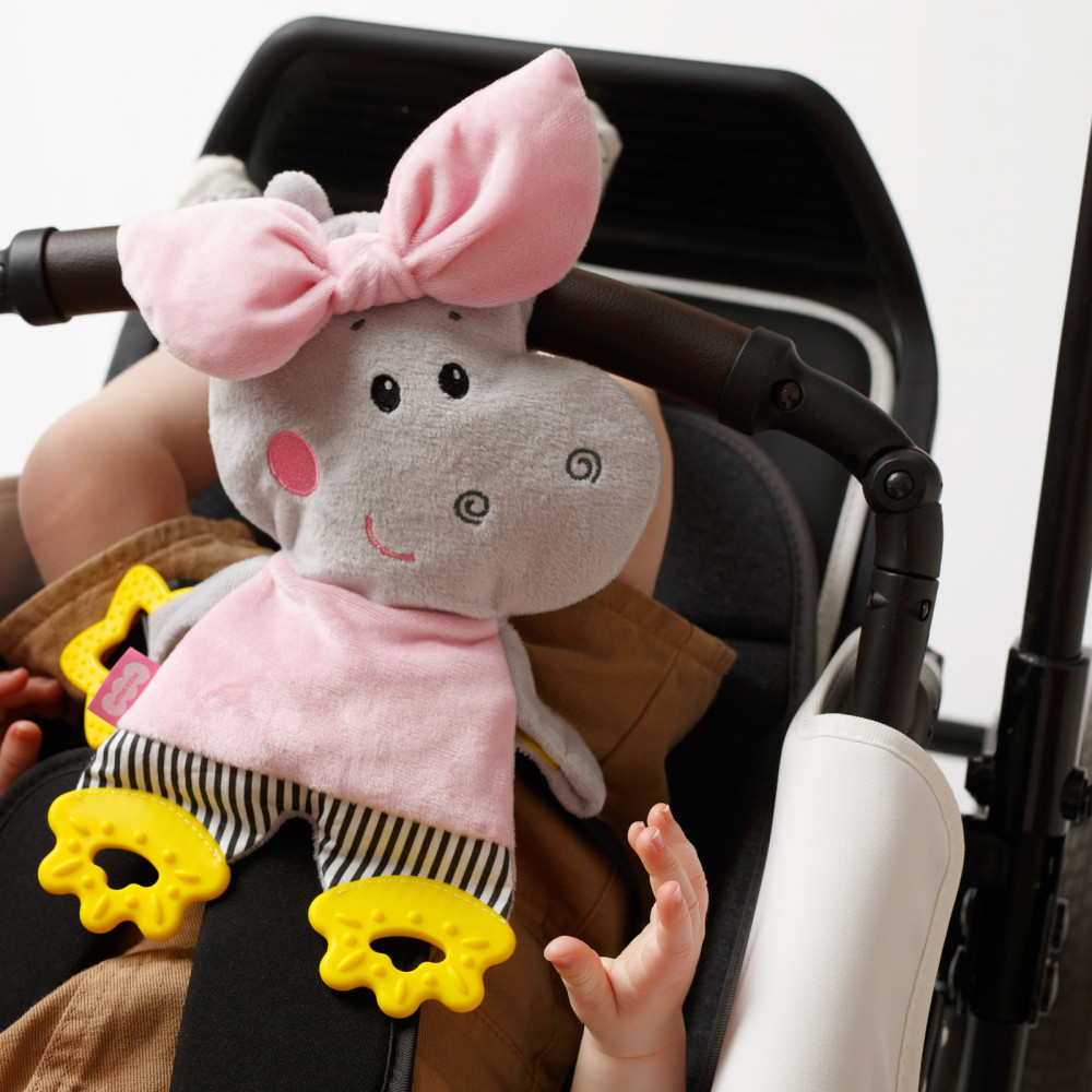 На спинке героя находится крепкая липучка, поэтому игрушка удобно крепится к коляске и автокреслу. Красивую, модную игрушку приятно брать с собой на прогулку и в путешествия. Также Бегемотика можно зафиксировать на кроватке ребенка. Малыш заинтересуется красочным и милым персонажем, внутри которого забавная шуршалка, издающая смешные звуки. Мягкие грызунки на лапках уменьшат дискомфорт при прорезывании зубов малыша.