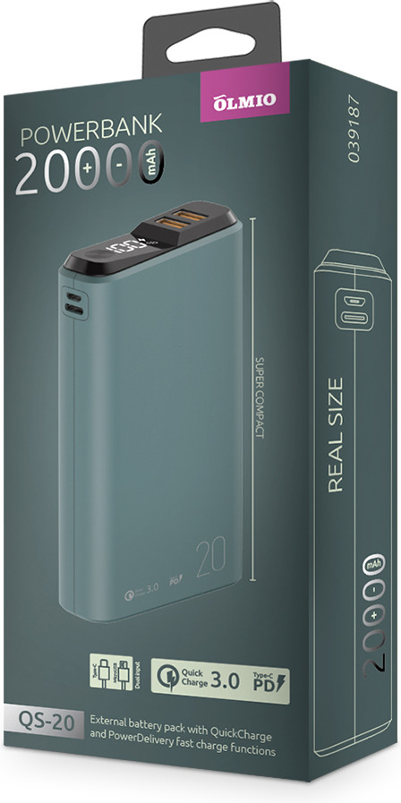 Модель оснащена сенсорной кнопкой управления и отображает проценты заряда в цифрах на ярком цифровом LED дисплее. Olmio QS-20 заряжается кабелем Type-C или microUSB. Это наиболее популярные варианты разъемов в современных смартфонах, поэтому Вы можете заряжать power bank и телефон одним кабелем. Модель получила три выходных разъема: двунаправленный Type-C на вход и выход, а также два разъема USB-A, поэтому может одновременно зарядить три гаджета.