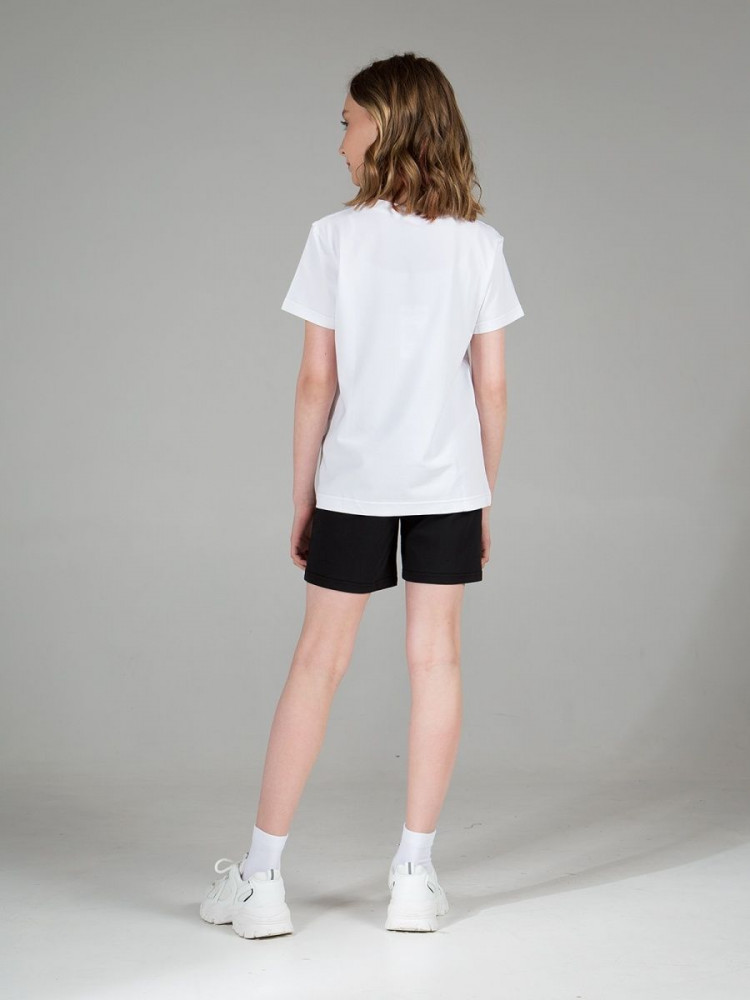 Стандартная х/б футболка. Добавлено совсем немного лайкры, оттого не стоит колом. То, что искали. Брали для физ.культуры. Брала ростовку 152/40, хотя рост дочери 140. В итоге футболка не особо велика оказалась.