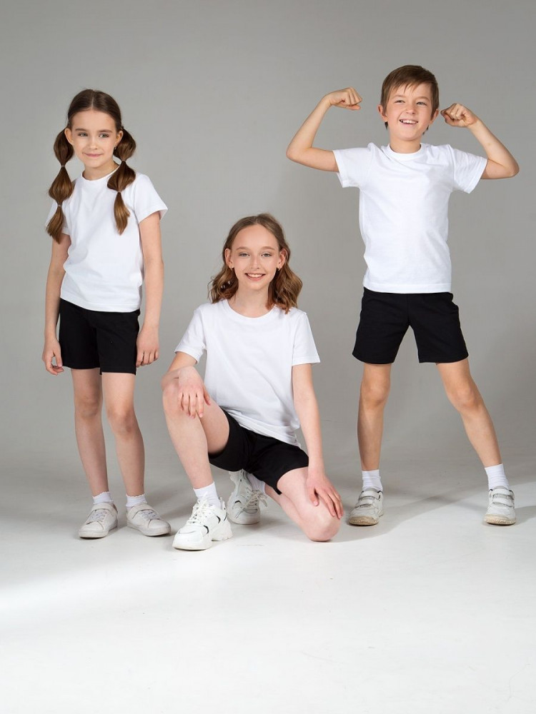 Стандартная х/б футболка. Добавлено совсем немного лайкры, оттого не стоит колом. То, что искали. Брали для физ.культуры. Брала ростовку 152/40, хотя рост дочери 140. В итоге футболка не особо велика оказалась.