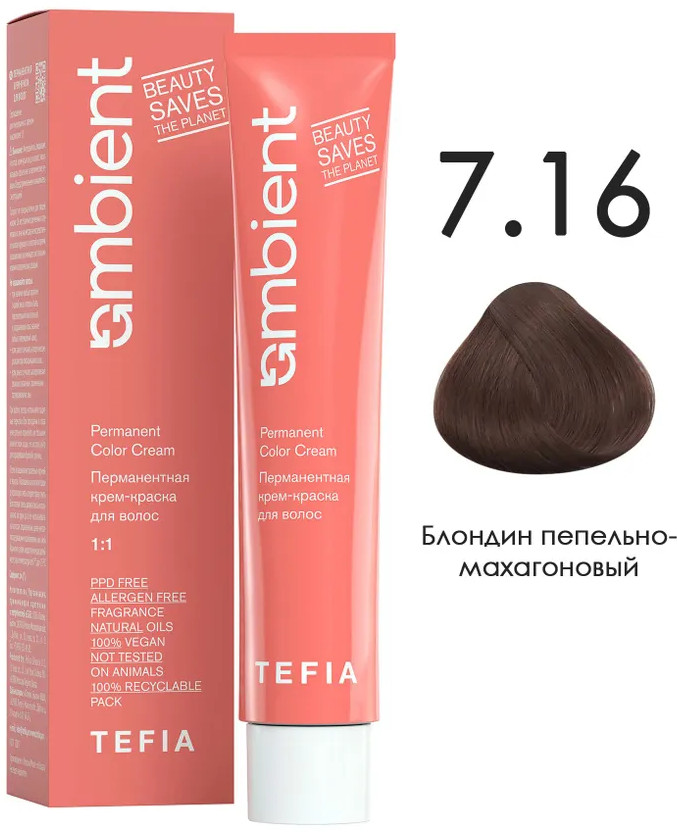 Tefia Крем-краска для волос перманентная, оттенок 7.16 блондин пепельно-махагоновый