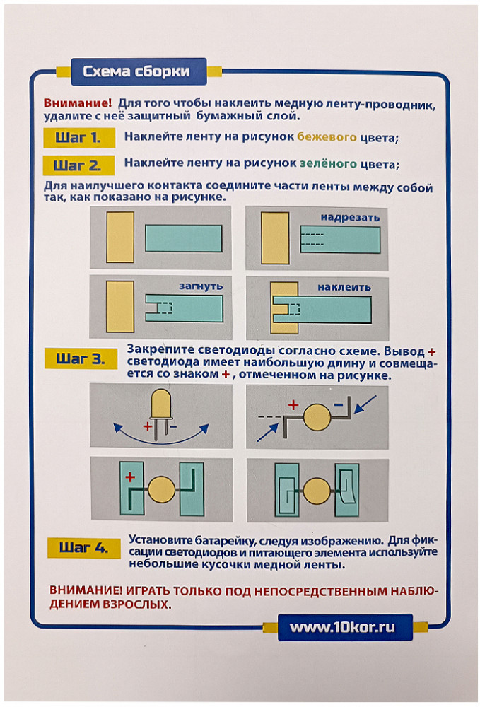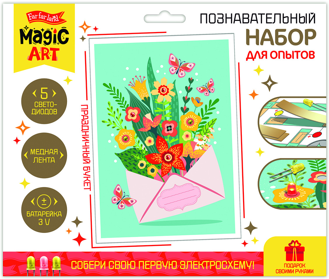 Набор для опытов «Праздничный букет» - набор для создания открытки с яркими светодиодными лампочками. Сделай яркую и необычную светящуюся открытку и подари друзьям! Для того, чтобы создать яркую открытку с горящими лампочками собственными руками, потребуются только ножницы и составляющие набора. Внимание! Набор для опытов предназначен для детей старше 14 лет. Играть с набором необходимо под непосредственным наблюдением взрослых! На обратной стороне коробки дана инструкция по сборке электросхемы. |