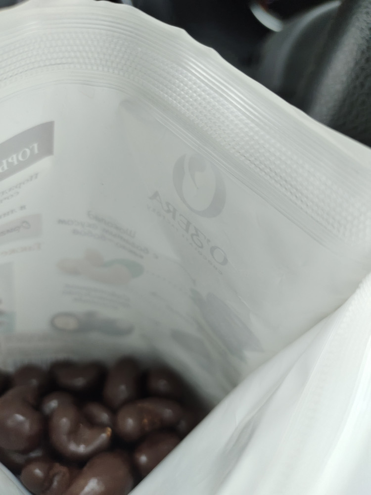 очень вкусные конфеты, пришли все целые, запах приятный, упаковка целая , интересная застёжка в виде липучек очень удобно в дороге - даже если пакет упадет орешки не выпадут