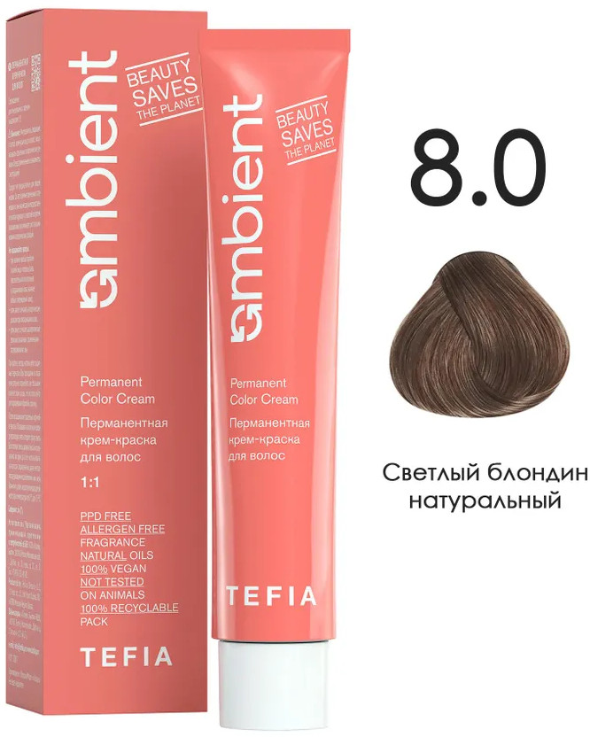 Tefia Крем-краска для волос перманентная, оттенок 8.0 светлый блондин натуральный
